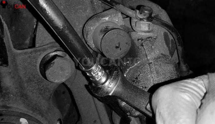 - Unscrew the BMW brake line from the caliper. Use a 14mm wrench to unscrew the brake line from your BMW brake caliper.