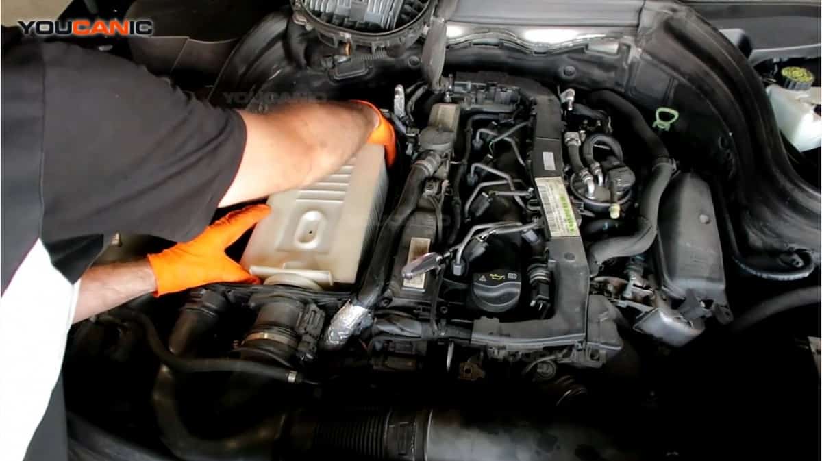 Remove the cover of the engine air filter. Loosen all seven T-25 screws using a Torx screwdriver. Then, pull the cap out and put it away to remove the engine air filter easily.The arrows indicate the location of T25 screws on the engine air filter cap; some of the T25 screws can be located under the cables. You must move the wires away to get to all of them.