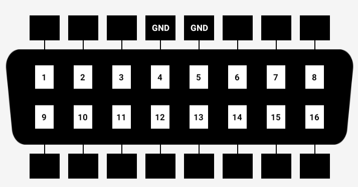 - The following screen will show the connection points of your OBD-II port. Please note that not every pin is connected to an electrical source, so it is important to verify the pinout of your vehicle before you begin testing. The image below shows a scanner that is connected to an OBD-II simulator. The ground points and battery voltage connections have been labeled.