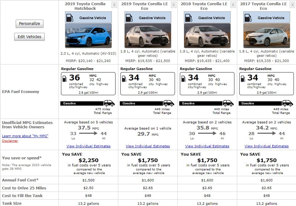 Toyota Corolla specifications, engine oil capacity, spark plug gap, safety rating, fuel consumption, transmission, and light bulb sizes.
